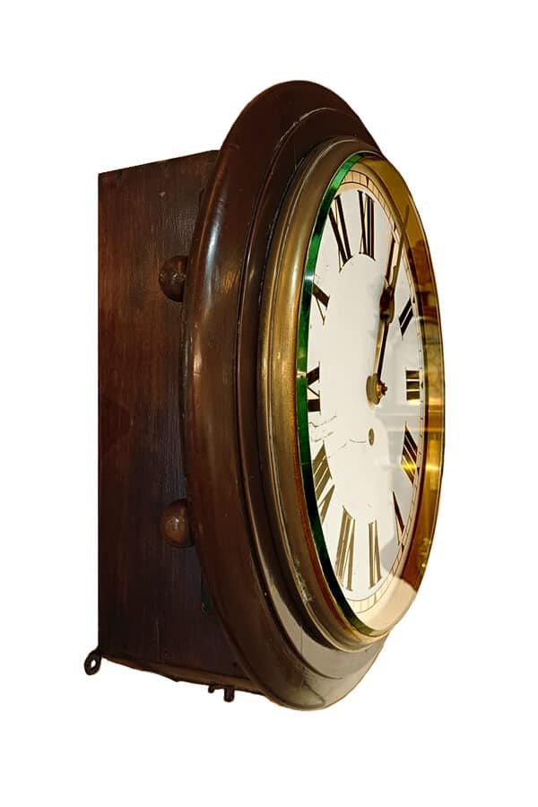 De klok is gemonteerd in een notenhoten kast en heeft een wijzerplaat met Romeinse cijfers voor de uren en streepjes voor de minuten.