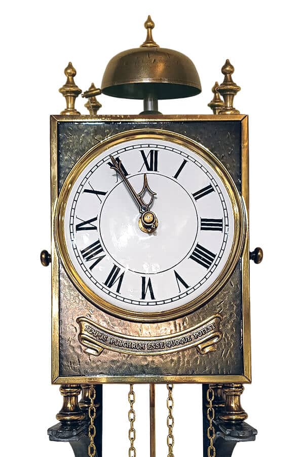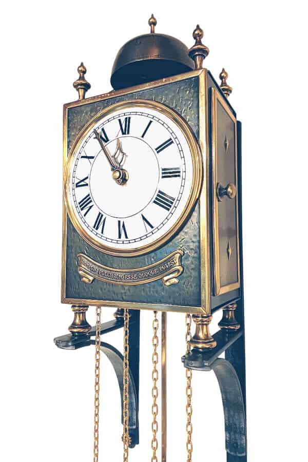 Charmante kleine B Pendule in massief messing kast. Deze klok heeft een 8 daags uurwerk met slagwerk op een bel. De halve uren slaat de klok één maal, de hele uren voluit. De witte emaillen wijzerplaat heeft Romeinse cijfers voor de uren en streepjes om de minuten aan te geven.