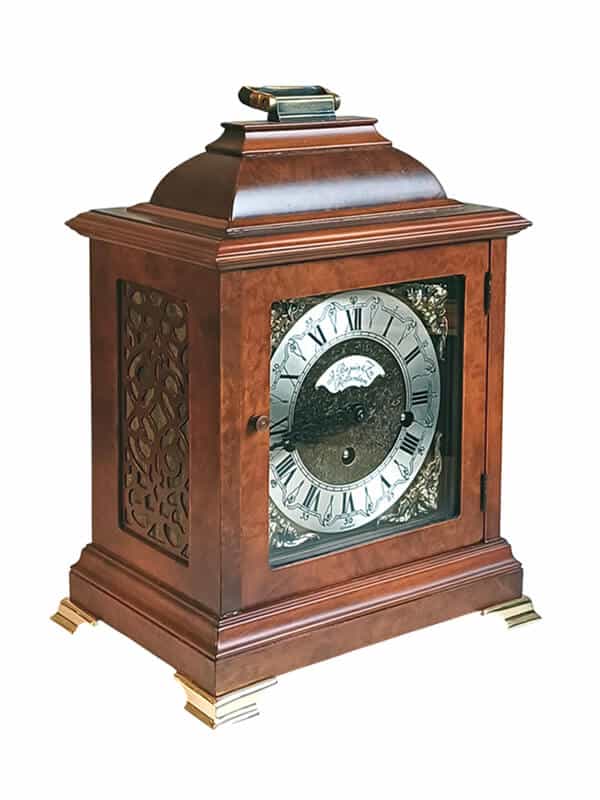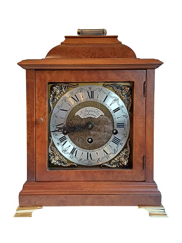 Klassieke, vintage tafelklok uitgevoerd in walnoot fineer, zijdeglans gelakt.