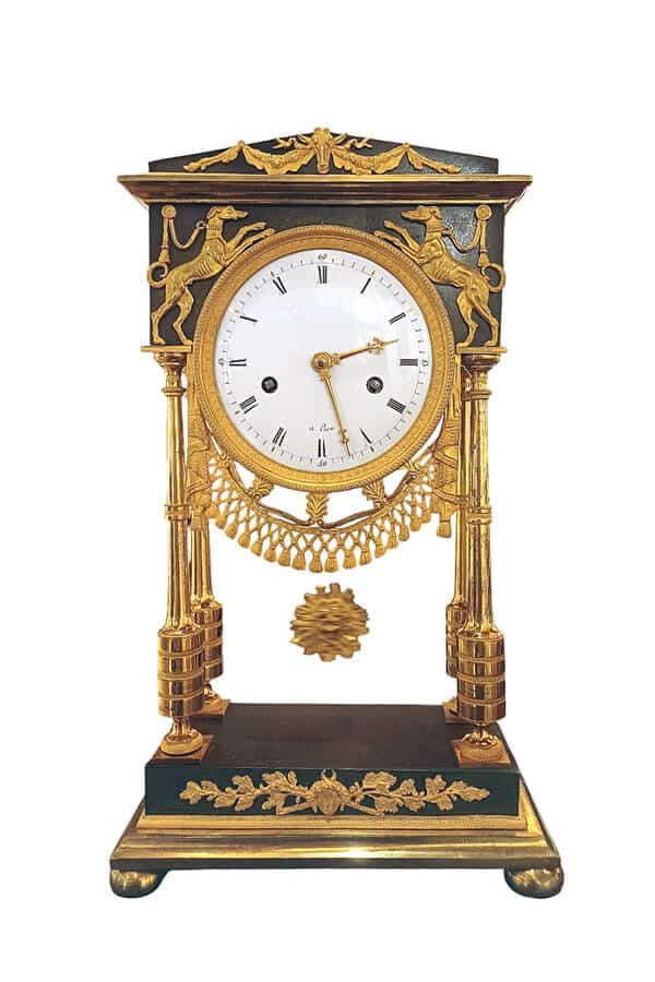 De gepatineerd bronzen kast is gedeeltelijk verguld en is versierd met gegoten en vergulde ornamenten. De behuizing van het uurwerk wordt gedragen door 4 vergulde zuilen. Aan weerskanten van de wijzerplaat staan windhonden afgebeeld. Het geheel staat op 4 bolvormige pootjes.
