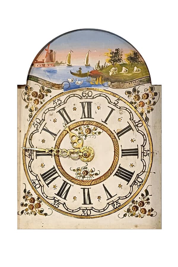 De wijzerplaat is door R.P lusthoff geschilderd. De uren worden aangegeven door Romeinse cijfers en de minuten door Arabische cijfers. Rond de cijferring bevinden zich gedeeltelijk vergulde decoraties van bloemen. In de toog een landschapje met bootjes en een molen.