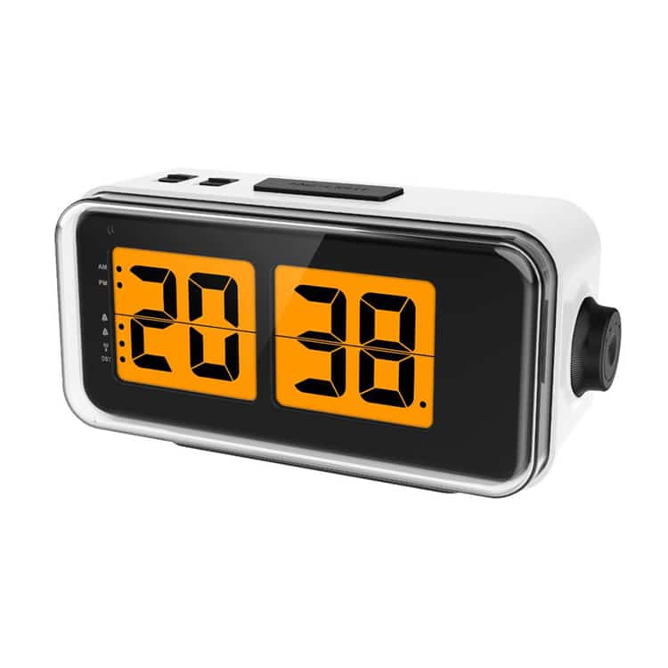 Radiografisch bestuurbare wekker met digitaal display. Handmatig afstemmen mogelijk. Dubbel alarm met Snooze functie. Kalender (dag, maand, jaar). Mogelijkheid om de binnentemperatuur weer te geven door afwisselende lus van tijd, kalender en temperatuur te activeren. Schemersensor die automatische displayverlichting mogelijk maakt.