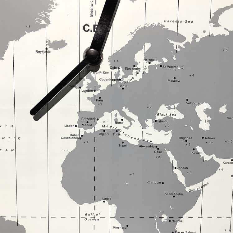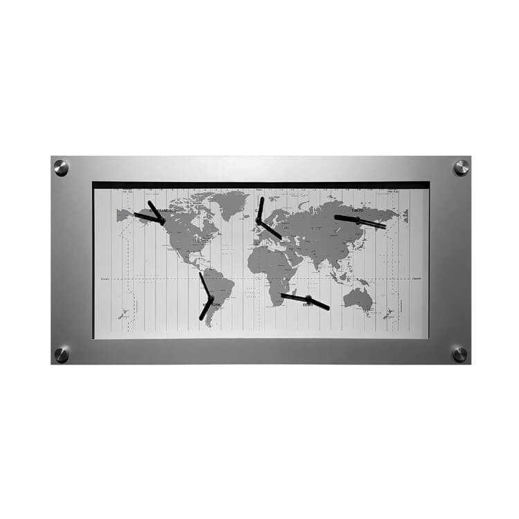 Wereldtijdenklok Grote wereldtijdenklok met 5 uurwerken, uitgevoerd in aluminium. Werkt op 5 AA, 1,5 volt batterijen ( inbegrepen ). maten: H: 39 cm, B: 80 cm, D: 6 cm Op voorraad. €150,00 Oorspronkelijke prijs was: €150,00.€125,00Huidige prijs is: €125,00. 2 op voorraad Wereldtijdenklok aantal Toevoegen aan winkelwagen